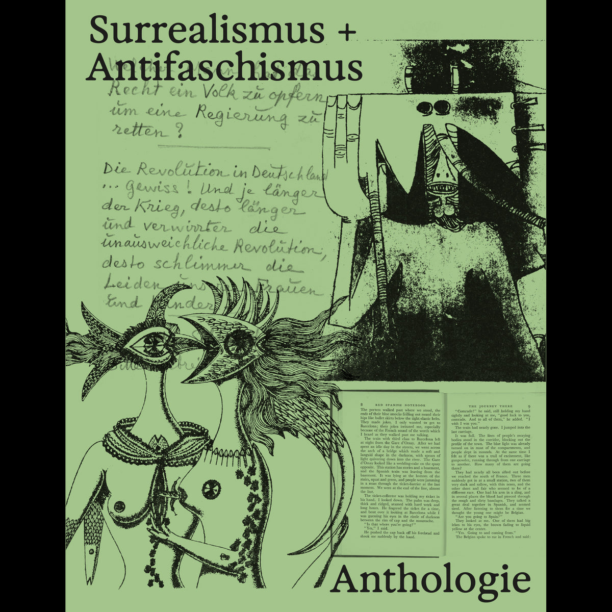 Ein Buch mit dem Titel Surrealismus + Antifaschismus, Anthologie. Der hellgrüne Umschlag zeigt eine surreale Illustration, Handschrift und ein Foto. Das Buch liegt auf einem weißen Hintergrund.