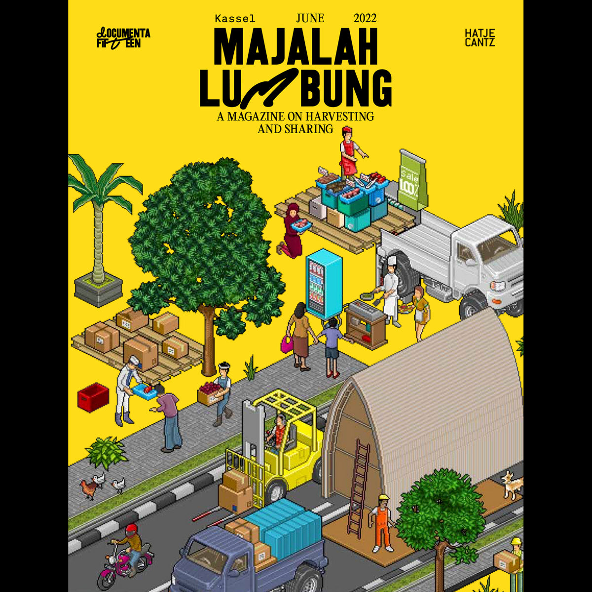 Im Rahmen der documenta fifteen veröffentlichen ruangrupa in Indonesien zwei Ausgaben eines Magazins, majalah, das sich auf den Kerngedanken der Ausstellung bezieht - die kollektive Arbeit. Der Namensbestandteil lumbung bezeichnet die kommunale Reisscheune, in der indonesische Bauern Ernteüberschüsse lagern, um sie zu teilen. Die beiden Ausgaben Ernten und Teilen erscheinen zur Ausstellung gemeinsam in einem Band. Mit Kurzgeschichten und Reportagen von führenden Journalist*innen, Forscher*innen und Schriftsteller*innen aus Indonesien berührt majalah lumbung Themen wie Kosmologie oder Architektur, Nahrung oder gemeinsames Essen, und bildet so ein inhaltliches Fundament für die documenta fifteen. Die einzelnen Beiträge vermitteln sich über zahlreiche Illustrationen und ein attraktives Layout mit der Qualität eines Magazins.