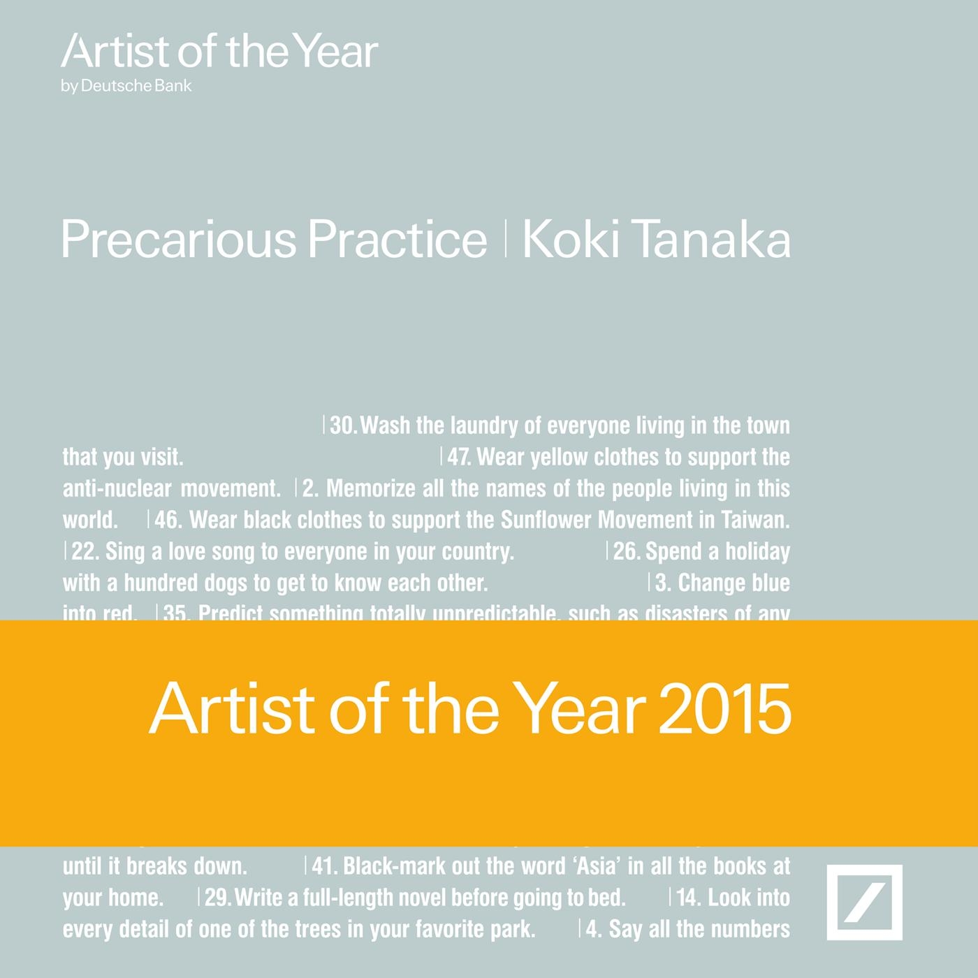 Die Deutsche Bank hat den »Künstler des Jahres« 2015 bekannt gegeben: Der Japaner Koki Tanaka ist der sechste internationale Künstler, der mit dieser Auszeichnung geehrt wird. Der renommierte chinesische Kurator Hou Hanru, Direktor des MAXXI in Rom, erläutert die Wahl so: »Als weltweit agierender Künstler mobilisiert Tanaka auf kluge Weise kollektive Aktionen. Er ermutigt die Mitwirkenden, sich auszutauschen, Gemeinschaftssinn und Kreativität zu entwickeln, wobei zugleich neue Regeln des Verhandelns und der Zusammenarbeit erprobt werden.« Koki Tanaka (*1975 in Tochigi, Japan) wurde durch Installationen und Aktionen bekannt, bei denen er Alltagsgegenstände und vor Ort gefundenes Material einsetzt. Ein wichtiger Bestandteil seiner Arbeit sind partizipative Projekte, für die er Akteure oder Ausstellungsbesucher mit einbezieht. 2013 bespielte er den Japanischen Pavillon auf der 55. Biennale in Venedig. Mit einfachen Versuchsanordnungen zeigte er dort, was für eine Herausforderung Kollaborationen sein können.