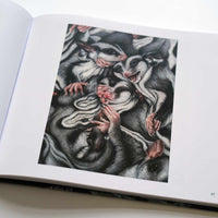 Ein aufgeschlagenes Buch zeigt eine hyperrealistische Malerei einer dichten Masse aus ineinander verschlungenen Gleithörnchen. Die Tiere haben teils aufgerissene Mäuler und große Augen, was einen chaotischen und intensiven Eindruck erweckt.