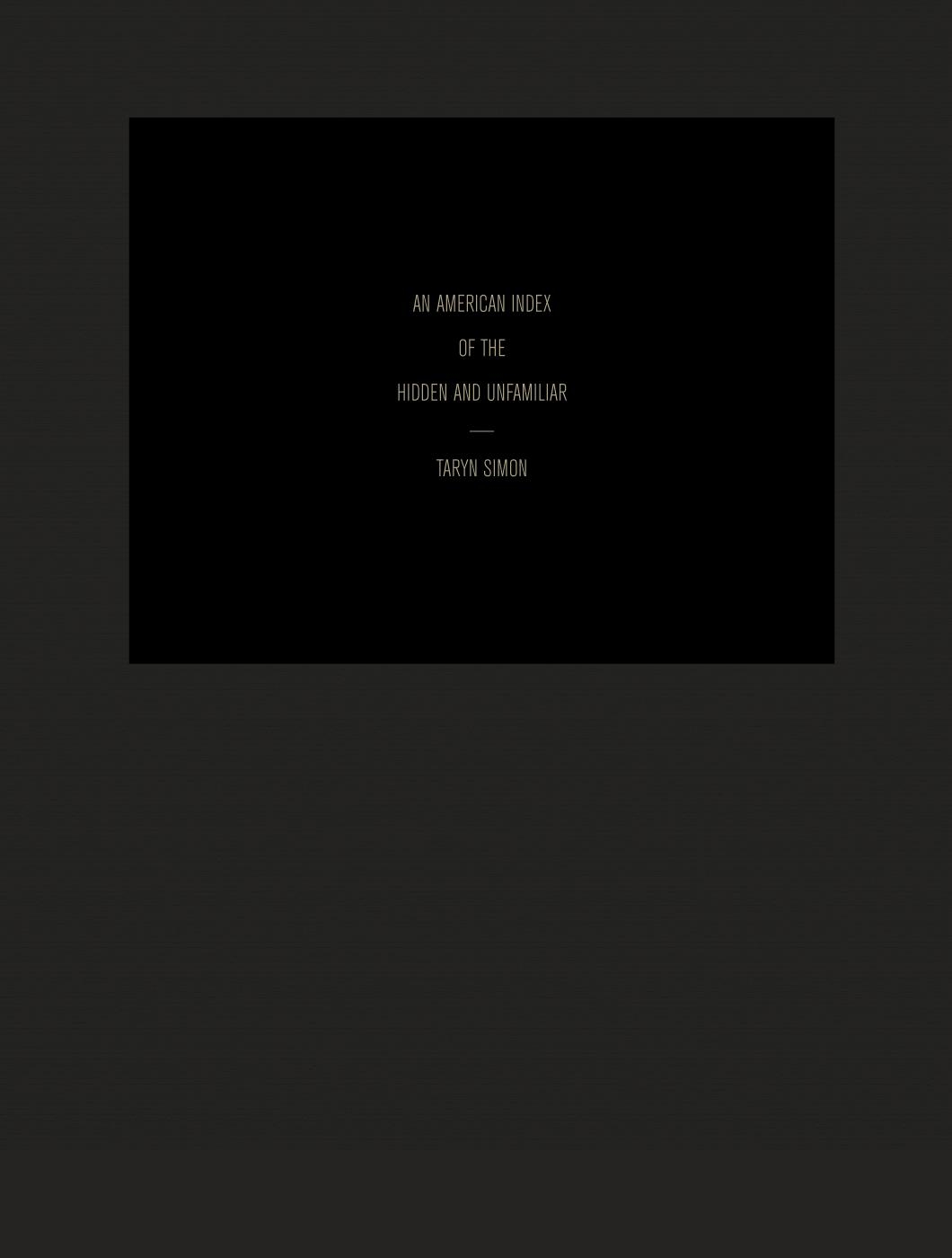»Ich bin jedem dankbar, der das Unmögliche vollbringt und mir ein Bild davon macht. Dann brauche ich es nämlich nicht zu tun und weiß doch, wie es war.« So Salman Rushdie über Taryn Simon in seinem Essay in diesem Band. Tatsächlich zeigt Taryn Simon (*1975) in ihrer berühmten Werkserie, die sie 2007 vollendete, das Versteckte, das Verbotene, das Unbetretbare in den USA . Was unter der Oberfläche des amerikanischen Mythos und des funktionierenden Alltags verborgen liegt. Nach mühevollen Verhandlungen im Vorfeld hielt sie mit der Großbildkamera im Bild fest, was sonst Eingeweihten vorbehalten bleibt: Container mit radioaktivem Atommüll, die Kunstsammlung des CIA, die Außenanlage einer »Body Farm« oder das Innere einer Bärenhöhle im Winter Die Künstlerin erläutert jedes ihrer fast 60 Bilder mit einer kurzen Beschreibung, die sowohl die Komplexität der Motive als auch der Beziehung zwischen Text und Bild betont.