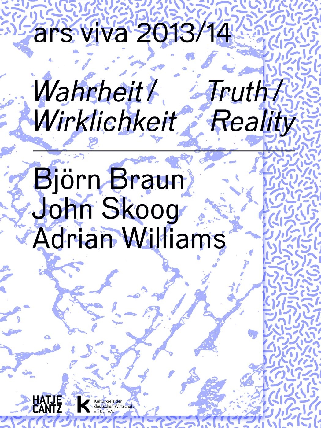 Der ars viva-Preis des Kulturkreises der deutschen Wirtschaft steht 2013 unter dem Thema »Wahrheit / Wirklichkeit«. Nicht nur in der Philosophie haben Fragen nach der Wahrheit und Wirklichkeit wieder an Aktualität gewonnen, sondern auch in der Kunst - durch dokumentarische Strategien, Travestien und Reenactments. In den Werken der drei Preisträger spielen diese Suchbegriffe auf unterschiedliche Weise eine Rolle: Björn Braun (*1979 in Berlin) unterzieht in seinen Objekten, Collagen und Installationen Dinge einer materiellen und gedanklichen Metamorphose. John Skoog (*1985 in Malmö) begibt sich in seinen Filmen auf die Suche nach den Wahrheiten und Geschichten, die alltäglichen Momenten und Handlungen innewohnen. Die Installationen, Performances und Filme von Adrian Williams (*1979 in Portland, Oregon) kreisen oft um das Phänomen, dass schon ein Klang eine physische Realität evozieren kann.