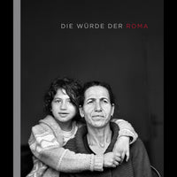 Ein Schwarz-Weiß-Foto einer Frau, die von einem Kind umarmt wird, auf dem Buchcover mit dem Titel Die Würde der Roma.
