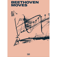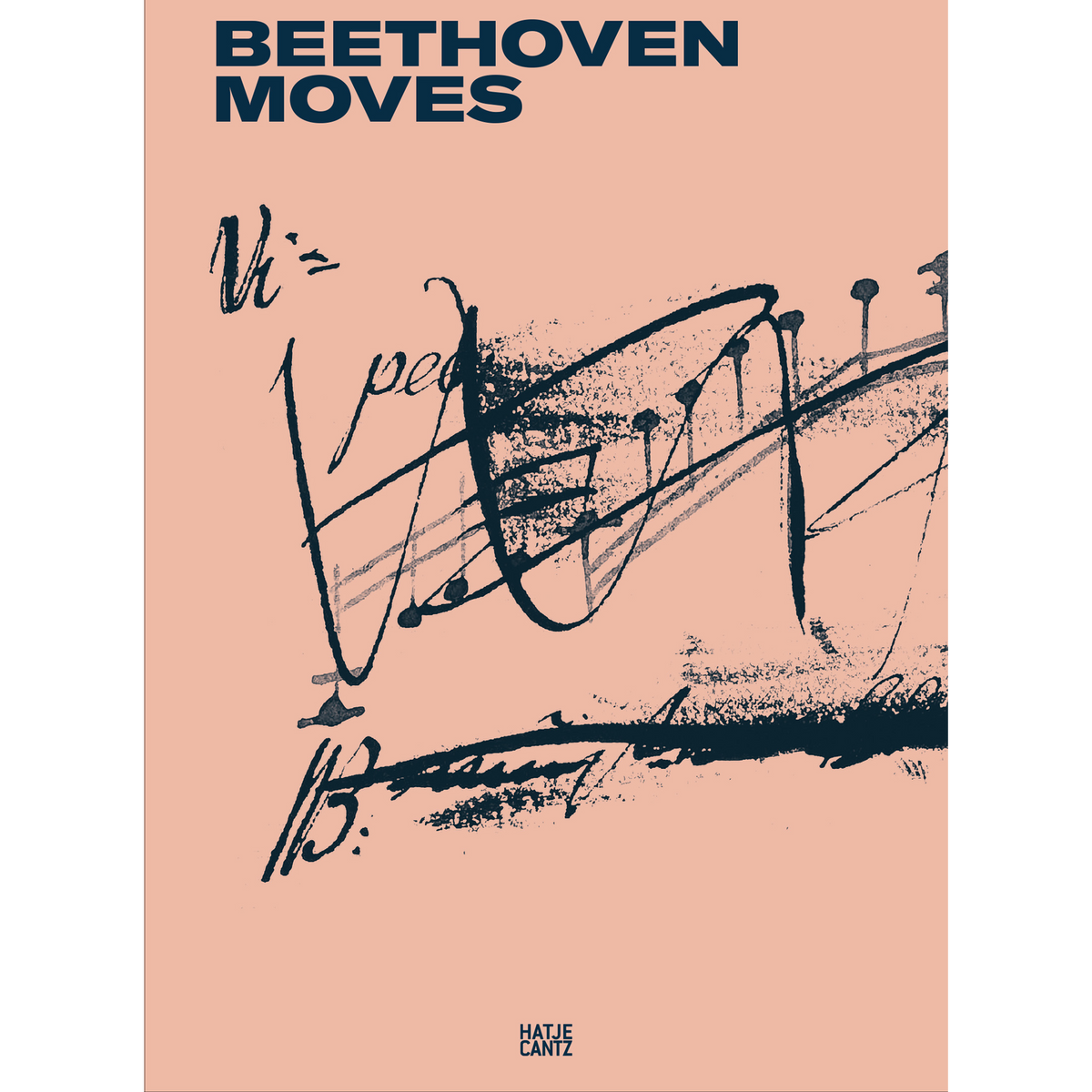 Buchcover von Beethoven Moves auf pfirsichfarbenem Grund. Darauf eine expressive, tuscheartige Zeichnung, die an eine Partitur erinnert. Der Titel steht in großen, blauen Lettern oben, das Logo von Hatje Cantz unten.