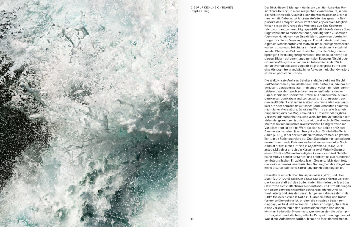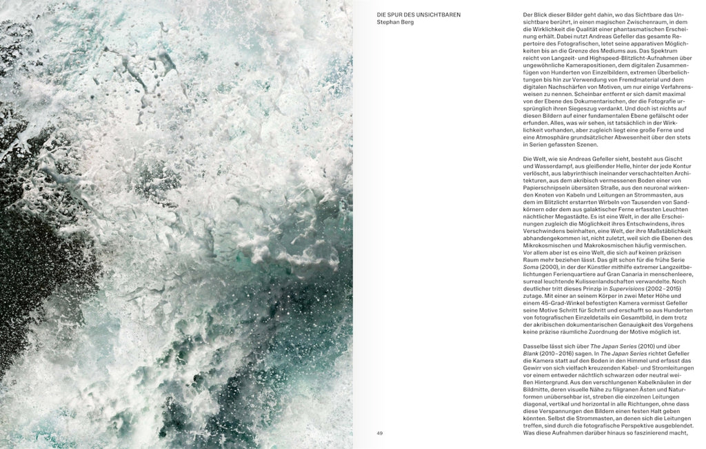 »Wie ein Besucher aus dem All versuche ich, einen Blick von außen auf den Lebensraum des Menschen zu werfen - voller Neugier, aber auch mit Schrecken.« Die Möglichkeiten des Fotografischen bis an die Grenze des Mediums auslotend, geht Andreas Gefellers Blick dahin, wo das Sichtbare das Unsichtbare berührt. Von frühen dokumentarischen Serien zu digital konstruierten Perspektiven und metaphorisch lesbaren Arbeiten vereint die neue Publikation bislang nicht veröffentlichte Fotografien, Schlüsselbilder seiner bekannten Werkreihen und neueste Arbeiten. Die Retrospektive offenbart, wie der Fotokünstler Techniken wie extreme Langzeit- und Überbelichtungen über Highspeed-Blitzlicht-Aufnahmen bis zu digitalen Collagen nutzt, um unsere menschlichen Wahrnehmungsgewohnheiten zu hinterfragen. In seiner Auseinandersetzung mit einer vom Menschen dominierten Natur schafft er Bilder von einer fast erhabenen abstrakt-malerischen Qualität, um von dort aus eine Entzauberung zu betreiben, die die wahre Realität des Gezeigten offenbart.