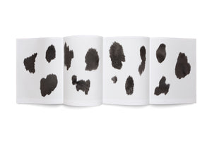 Ein aufgeschlagenes, ziehharmonika-artig gefaltetes Buch liegt auf einer weißen Oberfläche. Auf den vier sichtbaren Seiten sind unregelmäßige, schwarze Flecken mit einer fellartigen Textur abgebildet, die an das Muster eines Kuhfells erinnern.