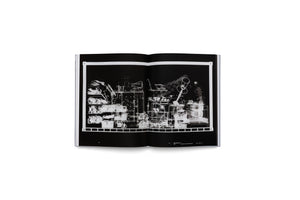 Ein aufgeschlagenes Buch liegt auf einer weißen Oberfläche. Auf der schwarzen Doppelseite ist eine Radiografie abgebildet, die als weißes Negativbild eine komplexe Ansammlung von diversen Gegenständen in einem Regal oder einer Vitrine zeigt.