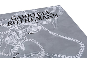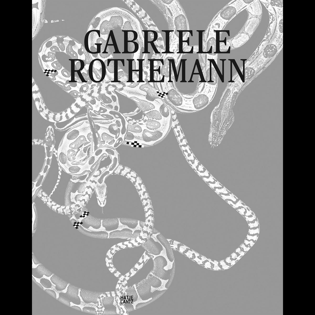 Ein graues Hardcover-Buch mit dem Titel Gabriele Rothemann liegt schräg auf einem weißen Hintergrund. Der Buchdeckel ist mit einer detaillierten Illustration von ineinander verschlungenen Schlangen in Schwarz-Weiß gestaltet.